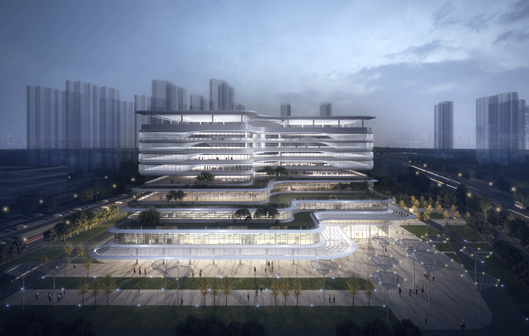 医院外形以“智碟·方舟”为设计理念,包含双核芯片以及光纤等设计元素,象征生命的健康律动。