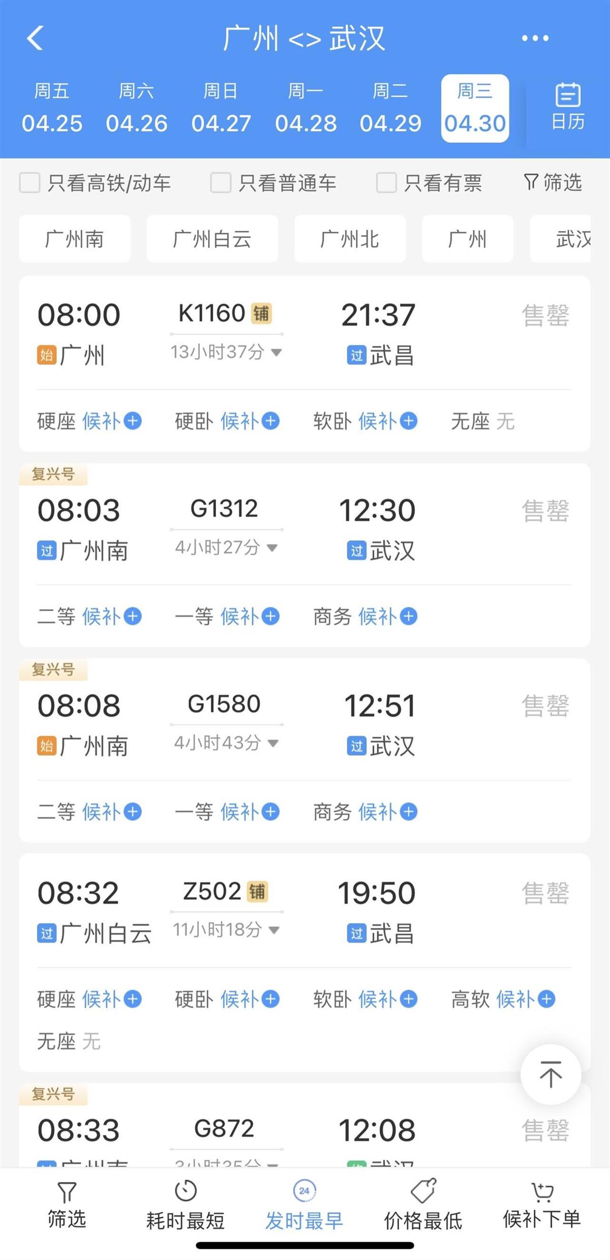 广州开往武汉的106个车次中,仅剩下10多个车次还有车票,但仅剩商务座票,一等座和二等座已全部售罄。部分席位的“候补”已显示为灰色字样,表示候补的人也已经排满了。