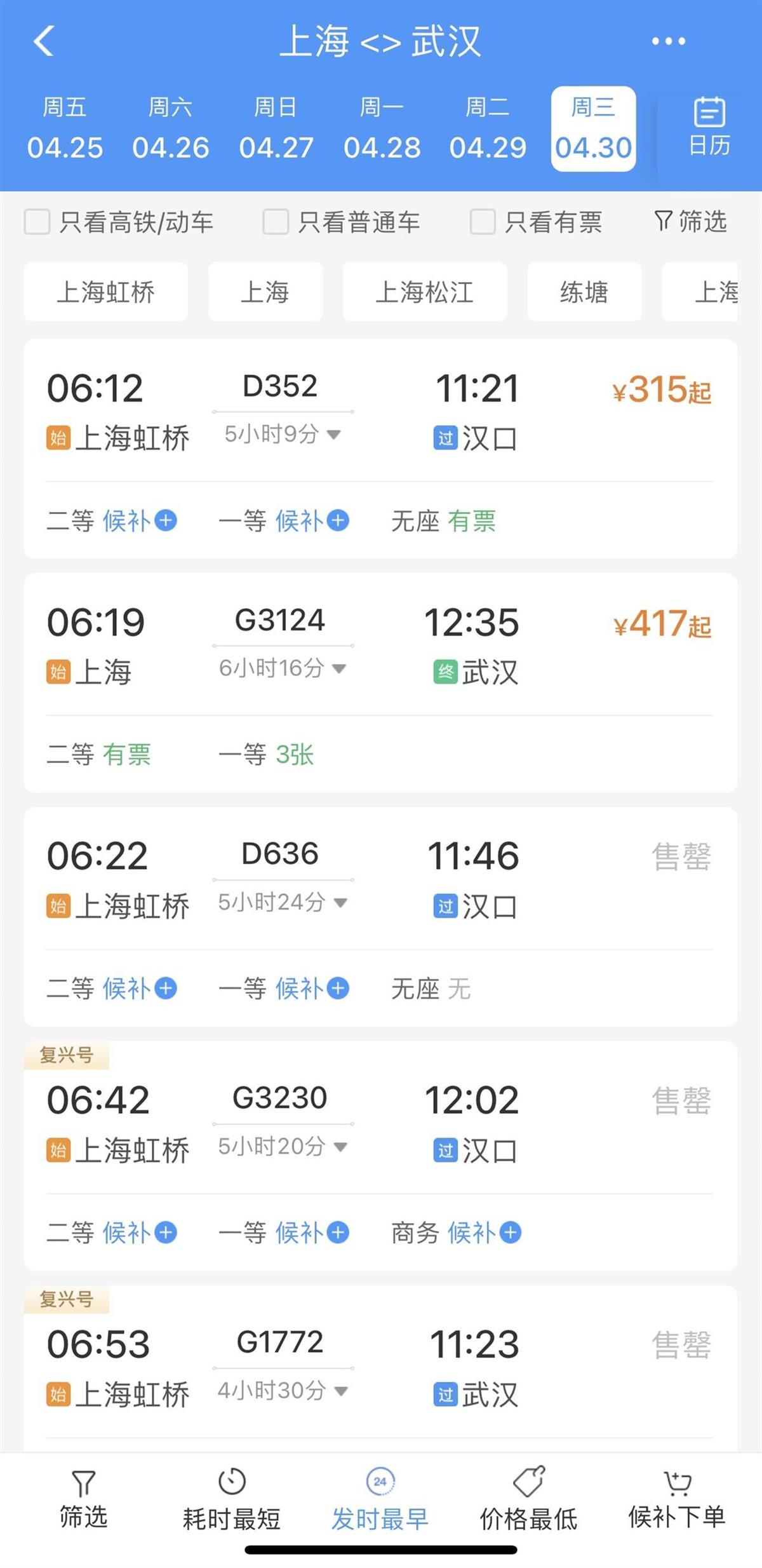 上海至武汉的火车票,绝大多数已售罄。目前仅有六七点的早班车还有几趟有余票,多为一等座和无座票。