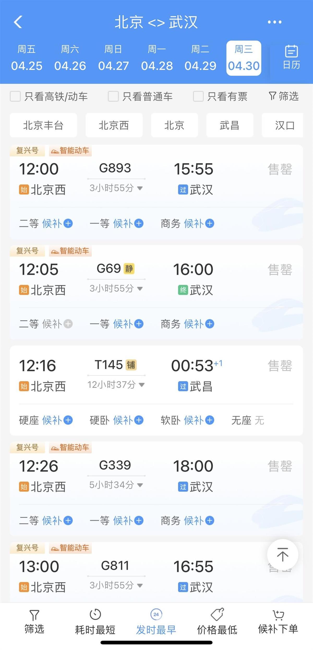 北京开往武汉共有61趟班列,既包括高铁动车,也有普速列车。新闻记者注意到,目前仅剩4趟还有极少量余票,其他车次所有席位全部显示售罄。