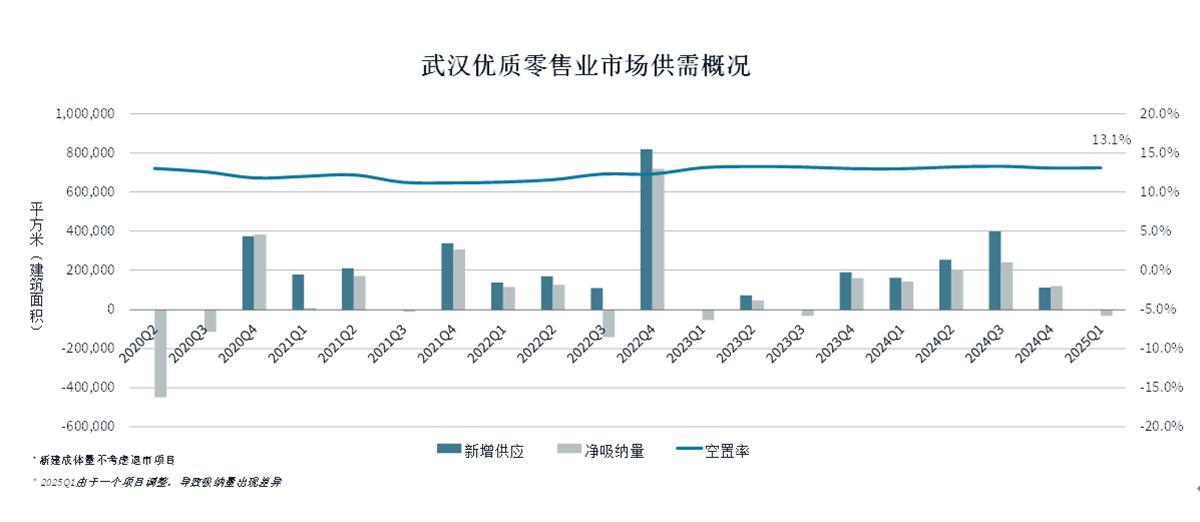 2025年第一季度武汉优质零售业市场无新项目入市。在经历了2024年的供应小高峰后,第一季度市场供需压力得到了一定的缓解,为存量项目提供了调整和优化的机会。截至3月末,武汉全市优质零售物业市场的总存量保持在958.3万平方米。
