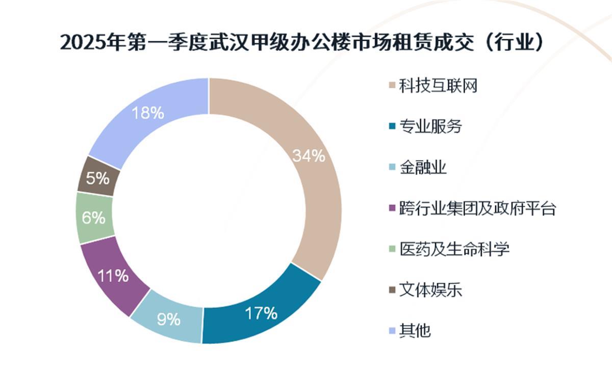 科技互联网和专业服务业持续支撑本季度武汉甲级办公楼市场需求。受以价换量和新项目入市等多重因素影响,武汉市甲级办公楼市场需求活跃度较2024年有所提升。从成交来看,科技互联网行业成交面积仍位于甲级办公楼市场总成交量首位,占比达到34%;其中,新入市项目贡献了约一半的租赁成交面积。此外,还录得多宗IT软件和互联网服务平台企业搬迁和扩租。专业服务业企业需求相对稳定,成交占比为17%。在市场供需压力下,部分跨行业集团持续进行内部及上下游企业的整合,促使第一季度跨行业集团及政府平台在甲级办公楼市场的总成交比例提升至11%。