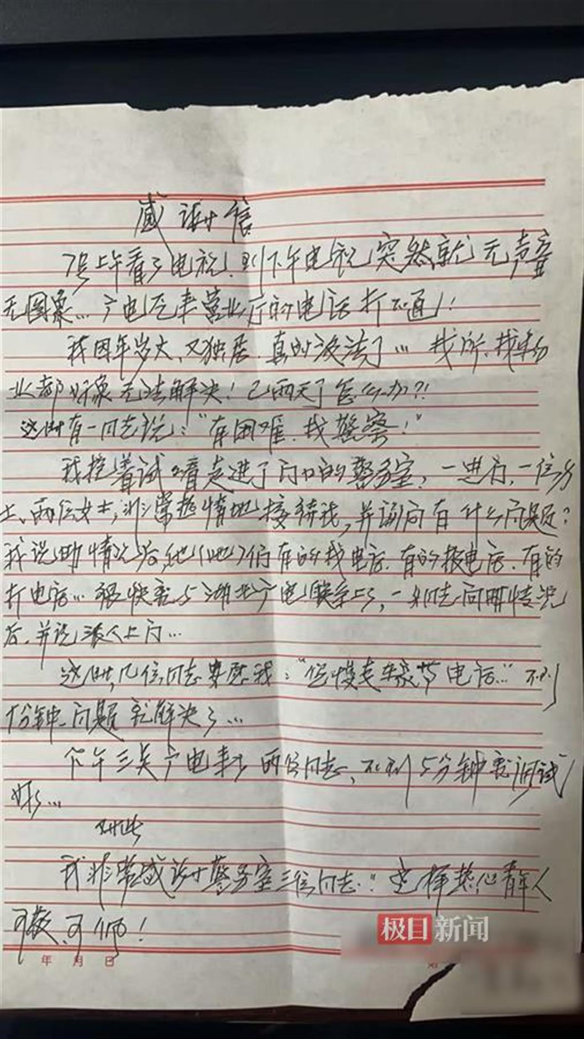 “我非常感谢警务室3位同志,这样热心的青年人,可敬、可仰!”4月10日上午,92岁的独居老人涂婆婆来到武汉市公安局洪山区分局珞南街派出所石牌园西警务室,将一封手写的感谢信送到警务室民警何峰和辅警沈漫妮、张丽华手中,感谢警方帮她解决一桩烦心事。