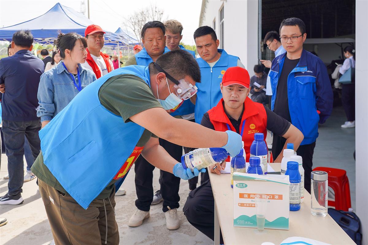 “先倒入少量水,然后按照可湿性粉剂、悬浮剂、水剂、乳油的顺序依次加入……”在农用无人机农药配比竞赛环节,参赛选手根据配制要求,按照二次稀释法进行药剂调配(各剂型为模拟药剂)。这一环节要求计算准确、调药顺序合理,并规范应用二次稀释法。
