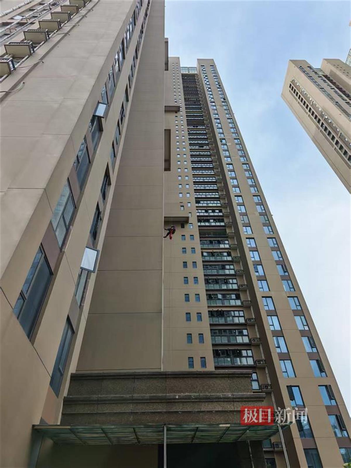 4月16日,新闻记者实地探访发现,事发楼栋已拉起警戒线,数名工人正系着安全绳进行高空作业,逐块敲击墙体进行排查。