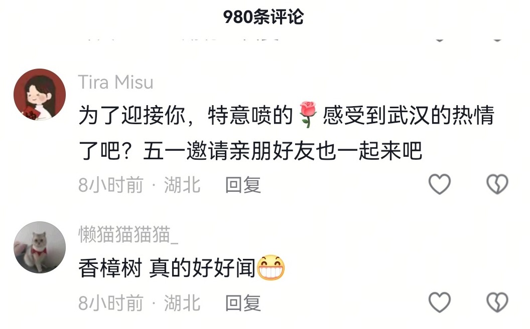 还有不少网友欢迎他来武汉玩:“为了迎接你,特意喷的,感受到武汉的热情了吧?五一邀请亲朋好友也一起来吧。”“因为你来了,所以就香了,要常来哦。”“爱上武汉没?武汉是一座香香的城市。”