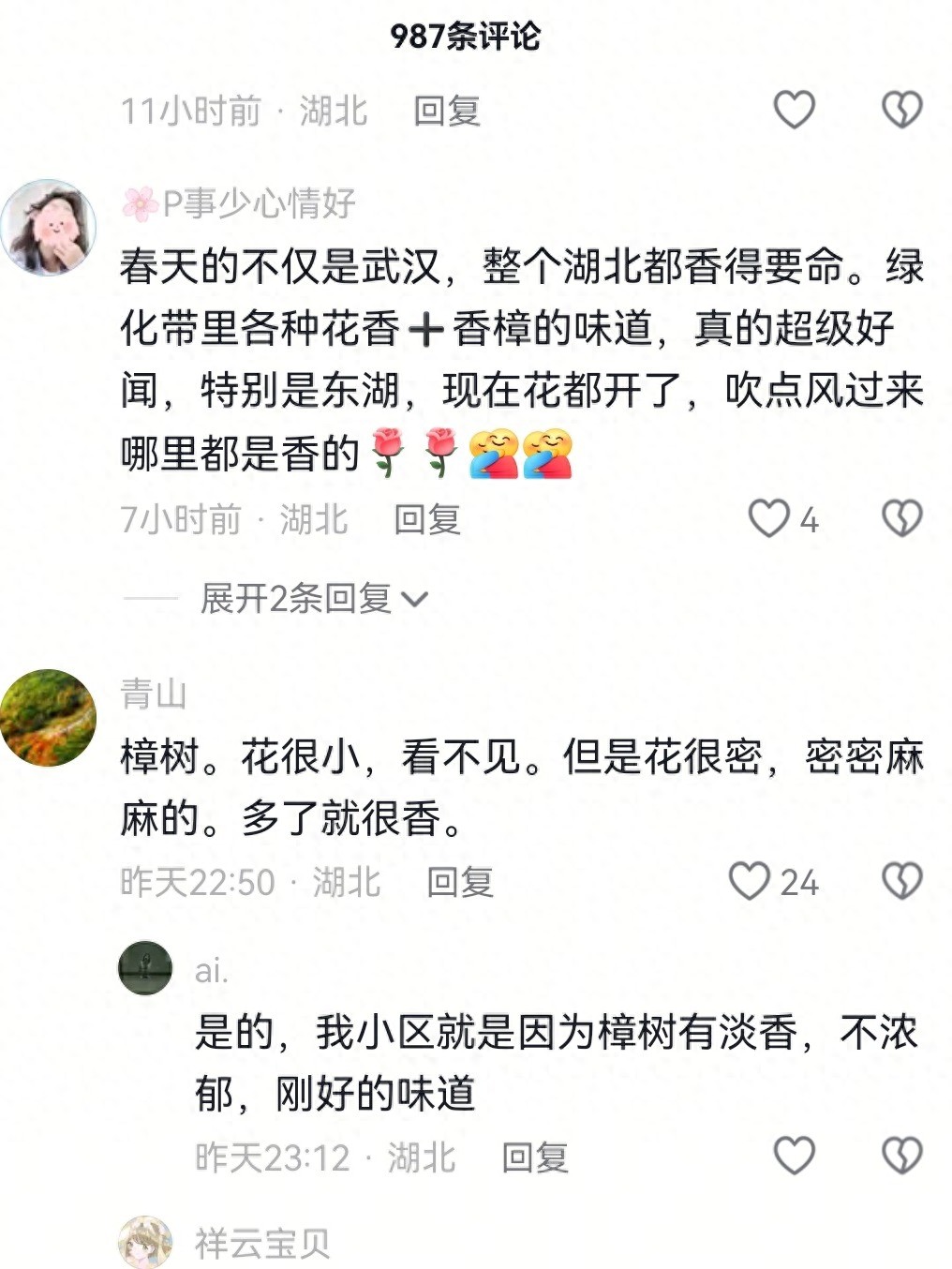 也有网友说:“你很幸运,错过了石楠花,遇见了柚子花,很香很香。”“武汉除了开石楠花的时候臭,其他时候都是香的。”