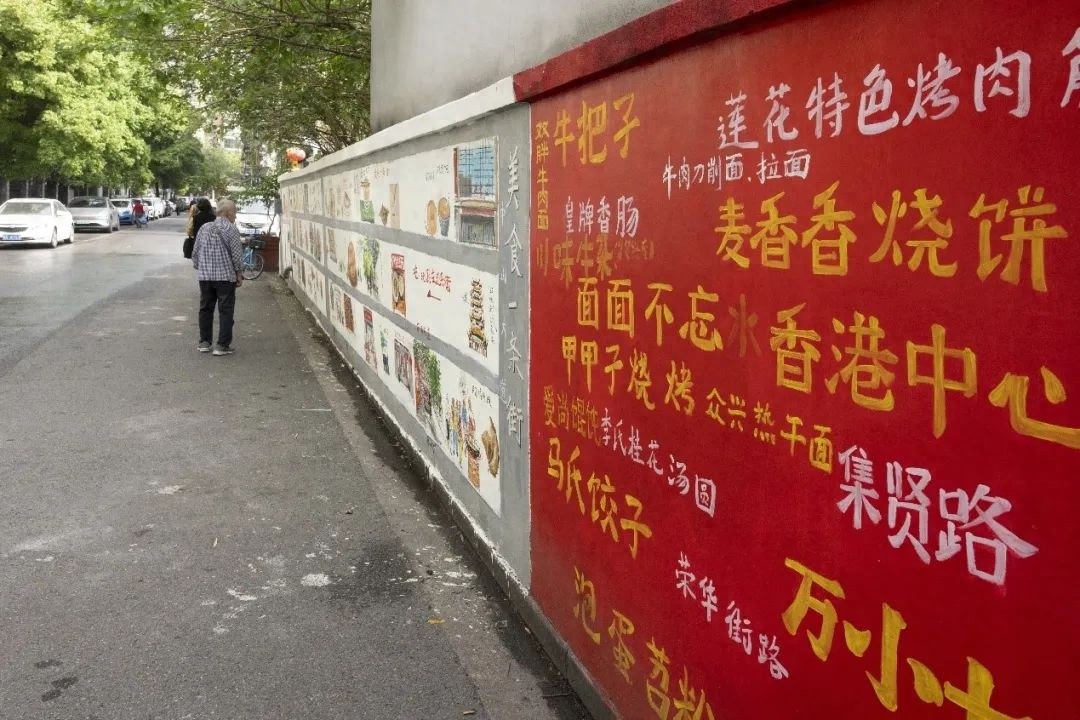 硚口区荣华街道荣华二路上的这一堵院墙,原本是一堵贴满牛皮藓小广告的墙,经易小阳之手变成了美食地图墙。以道路进行区分,网罗了周围1公里范围内的武汉特色美食,有双胖牛肉粉、麦麦香烧饼、罗记热干面,众兴特色热干面等,还配上了美食特色照片,形成一幅“舌尖上的导航图”。
