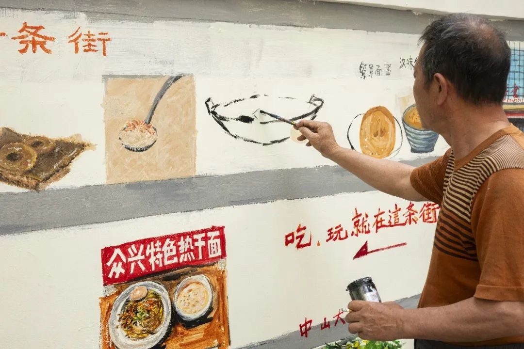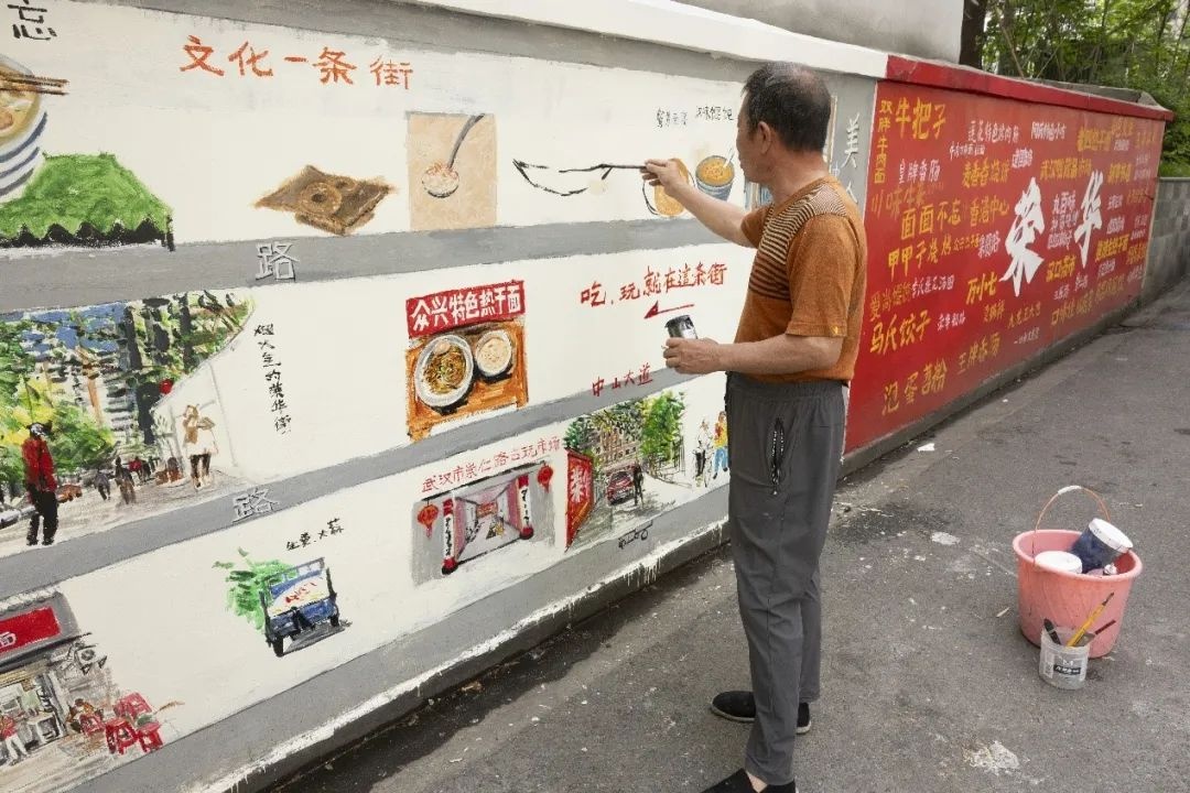 2025年4月18日,在硚口区荣华二路,武汉市退休美术教师易小阳将我市著名的传统小吃画上了路边的墙上,方便居民和游客了解和品尝武汉传统美食,现场作画的他当场得到广大居民的好评。