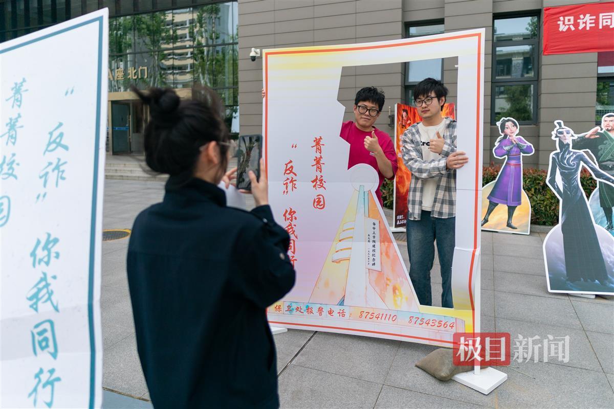 活动现场热闹非凡,学生们的身影穿梭其中,笑声、讨论声交织成一片。为增添活动的趣味性,同学们可选择性穿上《哪吒》电影中角色的cos服装,与精心设置的反诈标牌合影,便能参与后续丰富多彩的游戏环节。