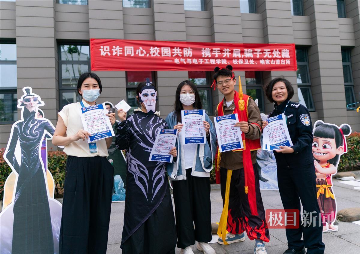 “看我混天绫护体!乾坤圈专套骗子!”4月17日,华中科技大学电气与电子工程学院门口的广场上,身披红绸、手拿乾坤圈的“哪吒”摆出炫酷造型。这不是漫展现场,而是武汉市公安局洪山区分局喻家山派出所联合校方打造的“青春无诈”主题游园会,让反诈知识乘着国潮旋风席卷校园。