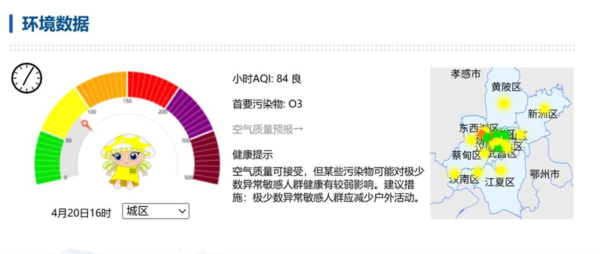 截至4月20日16时,武汉小时空气质量指数84,为良好。4月空气质量情况略有下滑,除了4月1日的严重污染天之外,另有一个中度污染天和4个轻度污染天。其余天数空气质量状况为良好。