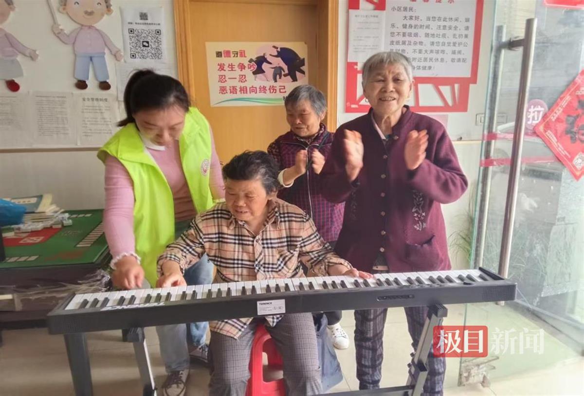 音乐活动区里,银发老人潘婆婆端坐在电子琴前,布满老茧的手指在琴键上轻快跳跃。舒缓的《茉莉花》旋律流淌而出,瞬间吸引了周围老人驻足。李婆婆跟着节奏轻轻摇晃身体,忍不住哼唱起来,一曲终了,掌声与赞叹声此起彼伏。“年轻时就爱弹琴,没想到老了还能和大伙儿分享!”潘婆婆笑着擦拭琴键,眼角满是自豪。