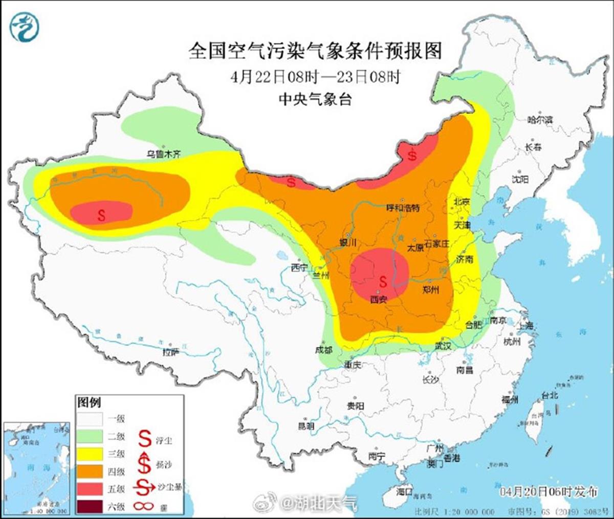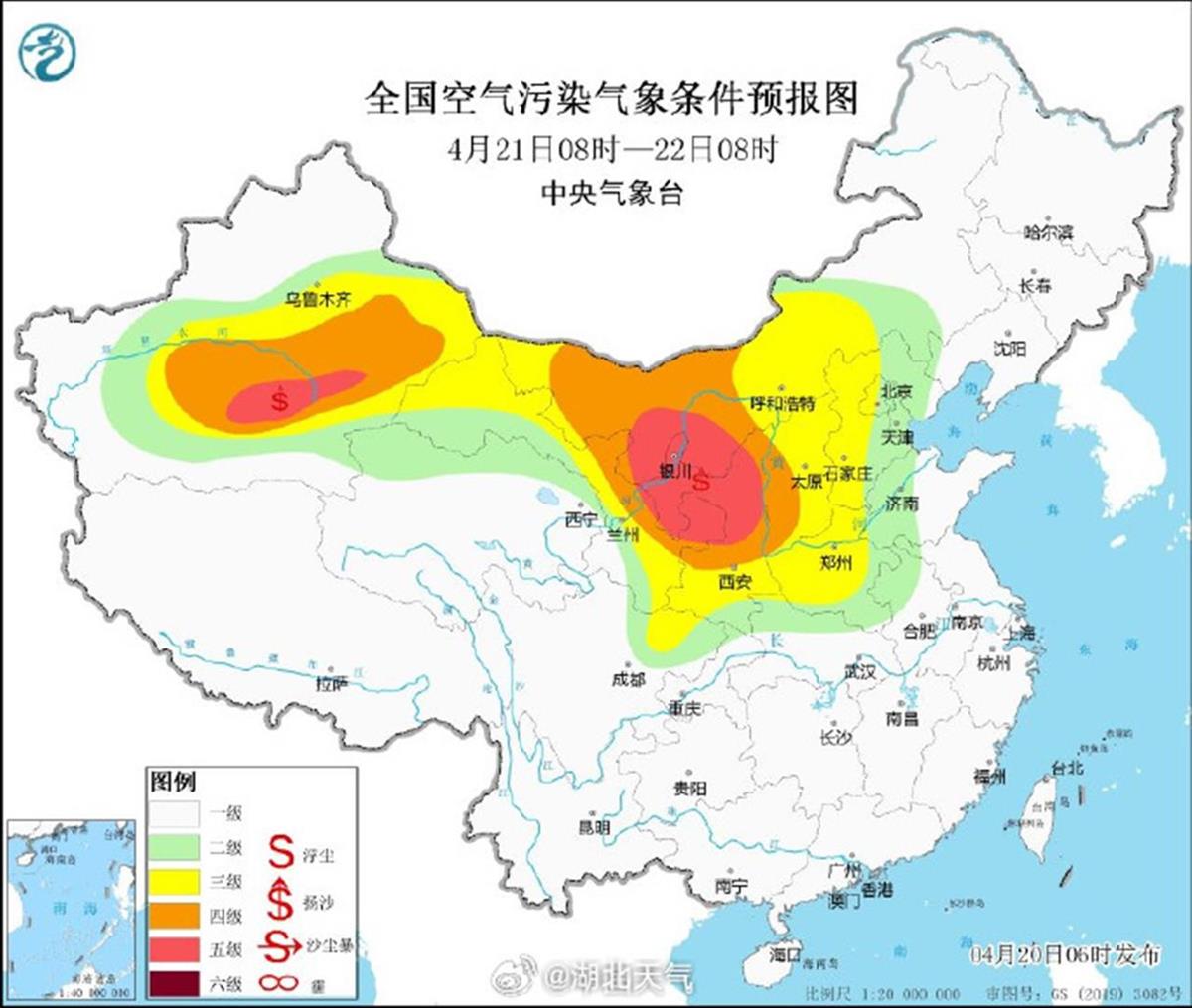 中央气象台今日(21日)06时继续发布沙尘暴蓝色预警:受冷空气大风影响,预计4月21日08时至22日08时,新疆南部和东部、青海北部、甘肃、内蒙古中西部、宁夏、陕西、山西、河北中西部、北京西部、河南中西部、山东西部、湖北西部、四川盆地北部等地有扬沙或浮尘天气,其中,新疆南部、内蒙古西部、甘肃西部等地的部分地区有沙尘暴。