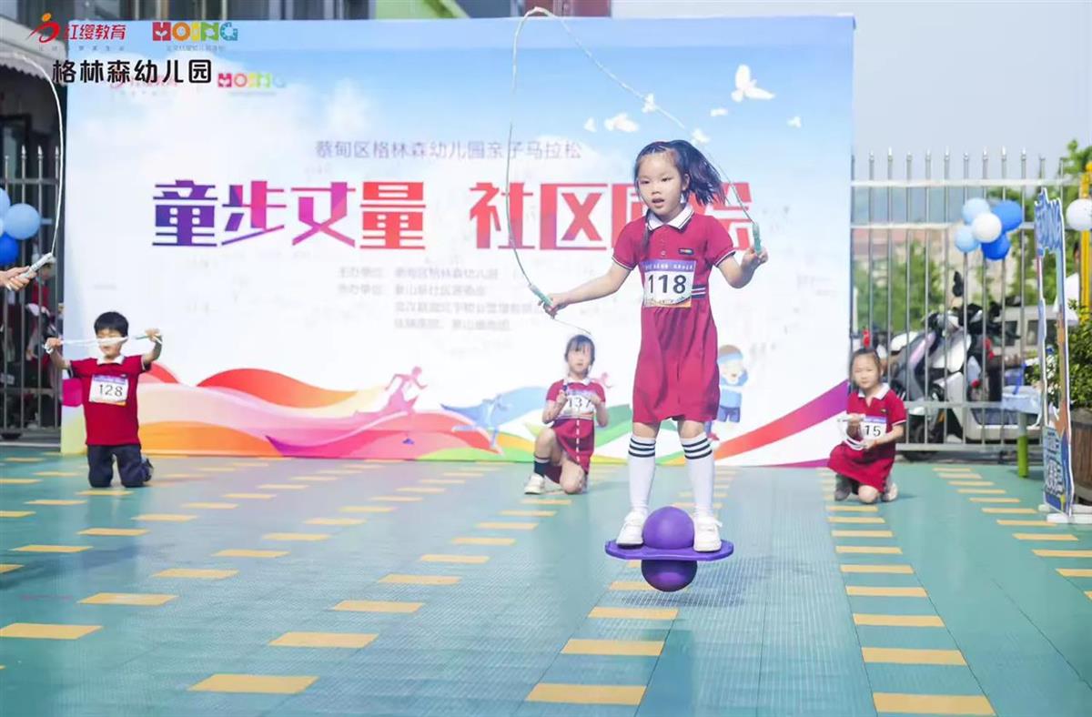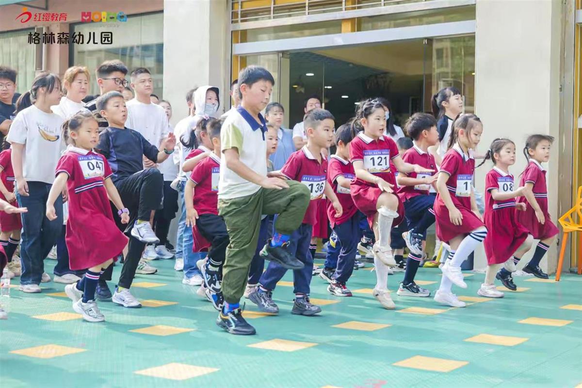 随着《向快乐出发》的动感旋律响起,身着红色园服的大班孩子们手持彩虹跳绳列队入场。整齐划一的交叉跳、双摇跳动作与彩色地垫交相辉映,118号女孩万娅昕的平衡球跳绳组合技引得观众席阵阵惊呼。翻飞的跳绳在阳光下划出金色弧线,将开幕式推向高潮。
