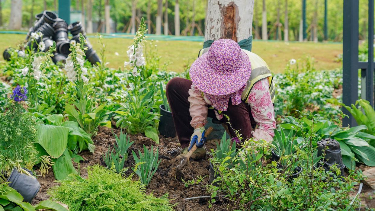 园林工人在中轴线两侧花境栽种花卉。李子云 摄