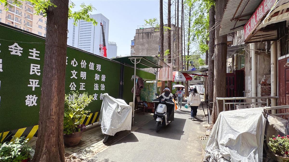 去年9月,工地刚开工就遇到了难题:周边原有的通道在工地内,为了保障居民通行安全,必须在工地外部改建一条新通道。为推进新通道改建,街道公管办与硚口城管协同作战,科学划定共享单车限停区域;协调交警,整治路边沿线地桩;发动社区上门宣传,劝导居民不要在门口堆放物资。