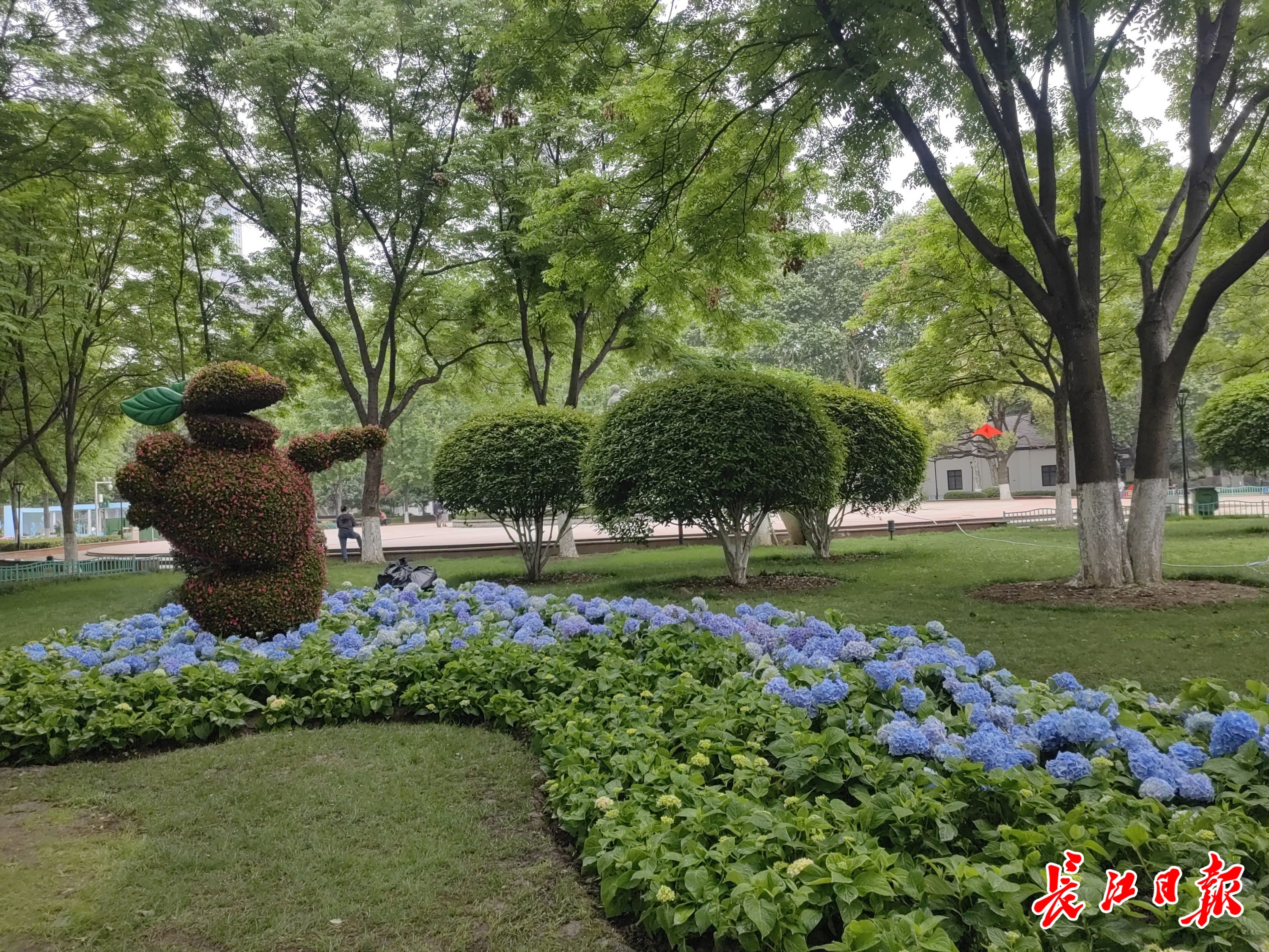 有趣的是,在胜利广场东侧的绣球花展区,园方还采用红绿草制作了电影《哪吒》中“石矶娘娘”形象的绿雕,引来不少市民驻足观赏。