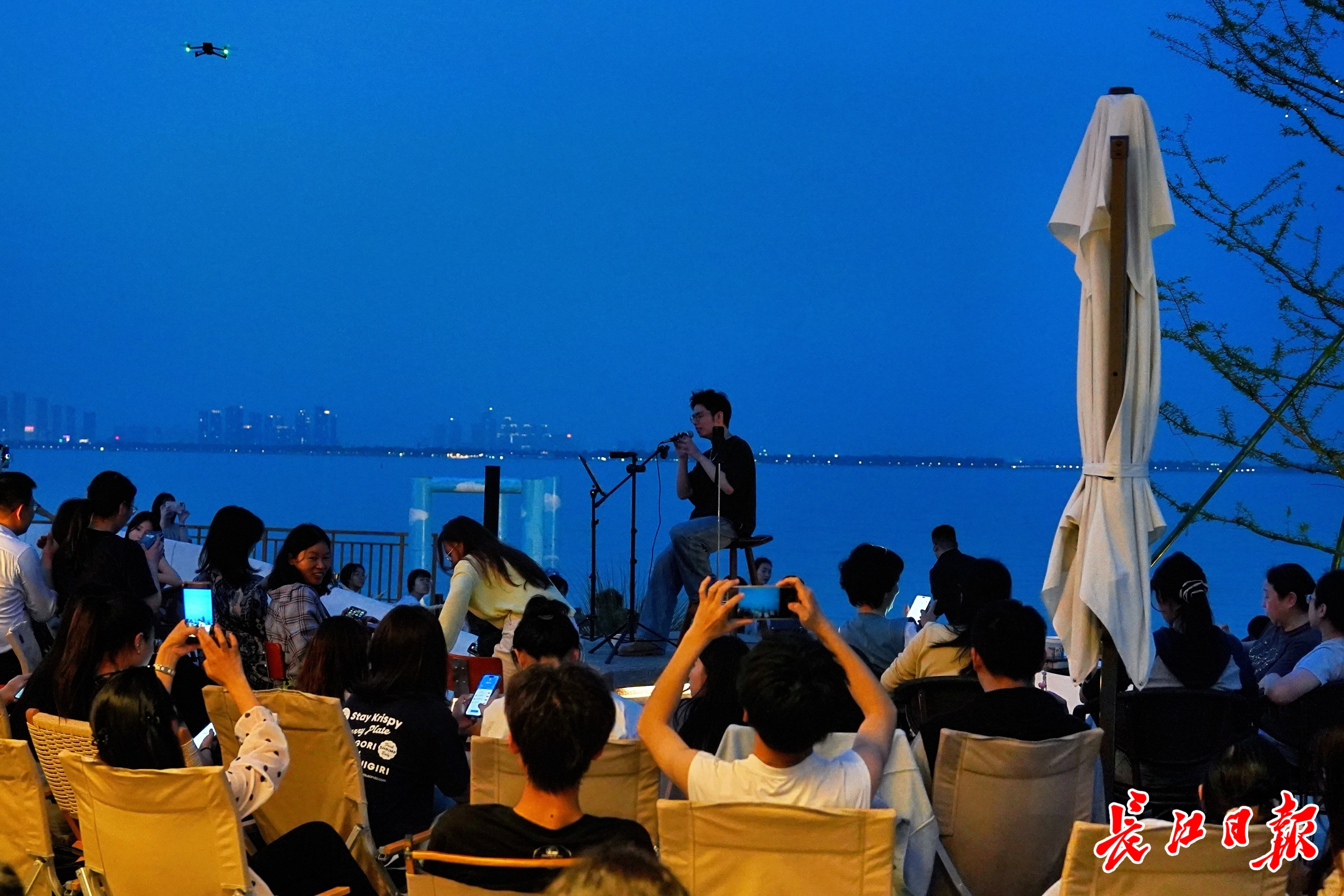 晚风中响起蓝调旋律。当暮色初临,东湖凌波门临湖栈道缀满星星灯串,歌手在现场歌唱,背后就是东湖。“这里的氛围太棒了,一边欣赏音乐,一边感受东湖的微风,随手拍都是文艺大片。”大学生小陈举着手机拍摄视频,“回去要把这些视频做成vlog,记录这段美好的时光。”