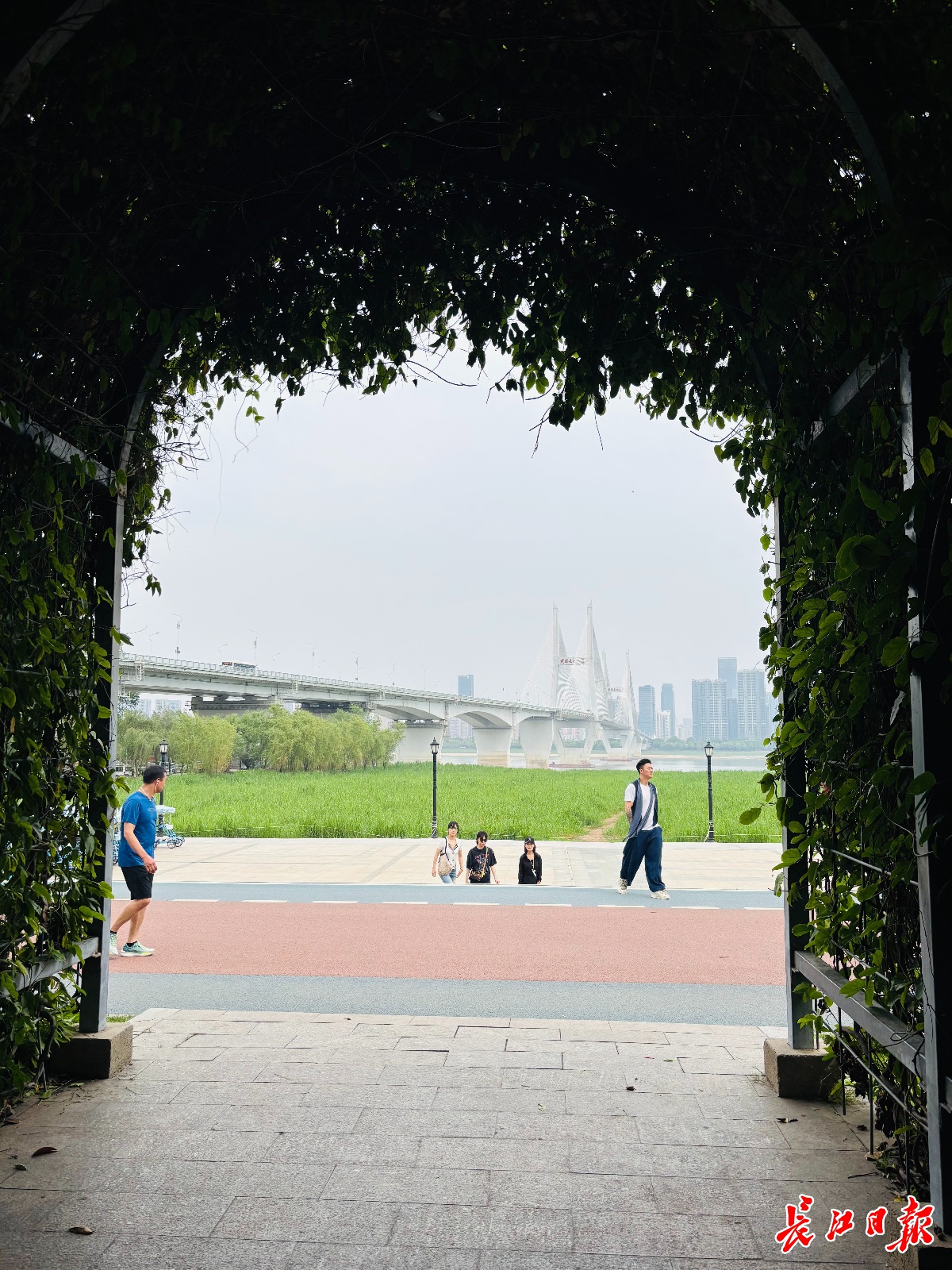 汉口江滩黄埔门入口处,绿藤拱门与长江二桥构成独特画面,成为网络上追捧的“梦幻”机位。郁郁葱葱的藤蔓爬满树洞,编织成一条自然的绿植隧道,像极了通往动漫世界的入口。一群年轻游客在此驻足拍照,镜头里面除了拱门、大桥,还有骑单车经过的游客。“这个角度太妙了,自然与现代建筑完美融合,发朋友圈肯定点赞无数!”一位年轻人兴奋地说。在网络上,博主们给出的拍照建议——这个机位在夏天叶子都变绿了才好看,“手机用3倍长焦及以上,相机包围曝光,很出片”。