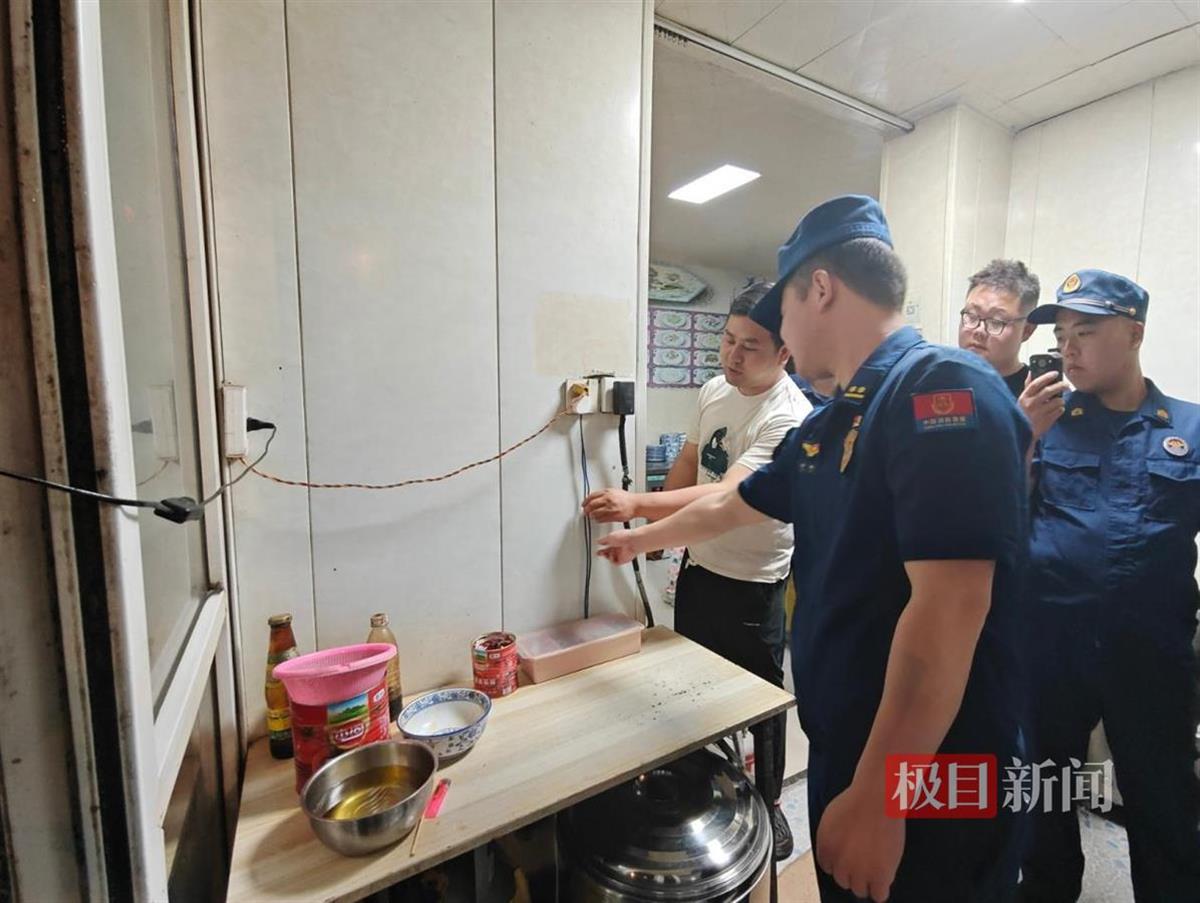 在东西湖区,巡防组联合社区工作人员来到朝阳街,在检查沿街商铺的过程中发现一家餐馆后厨内存在私拉乱接电线现象,巡防人员现场指导商户立即进行整改,对不符合标准的电线进行更换,对线路走向、接口重新做安全处理,并将电线全部做穿管保护。