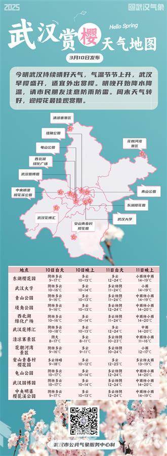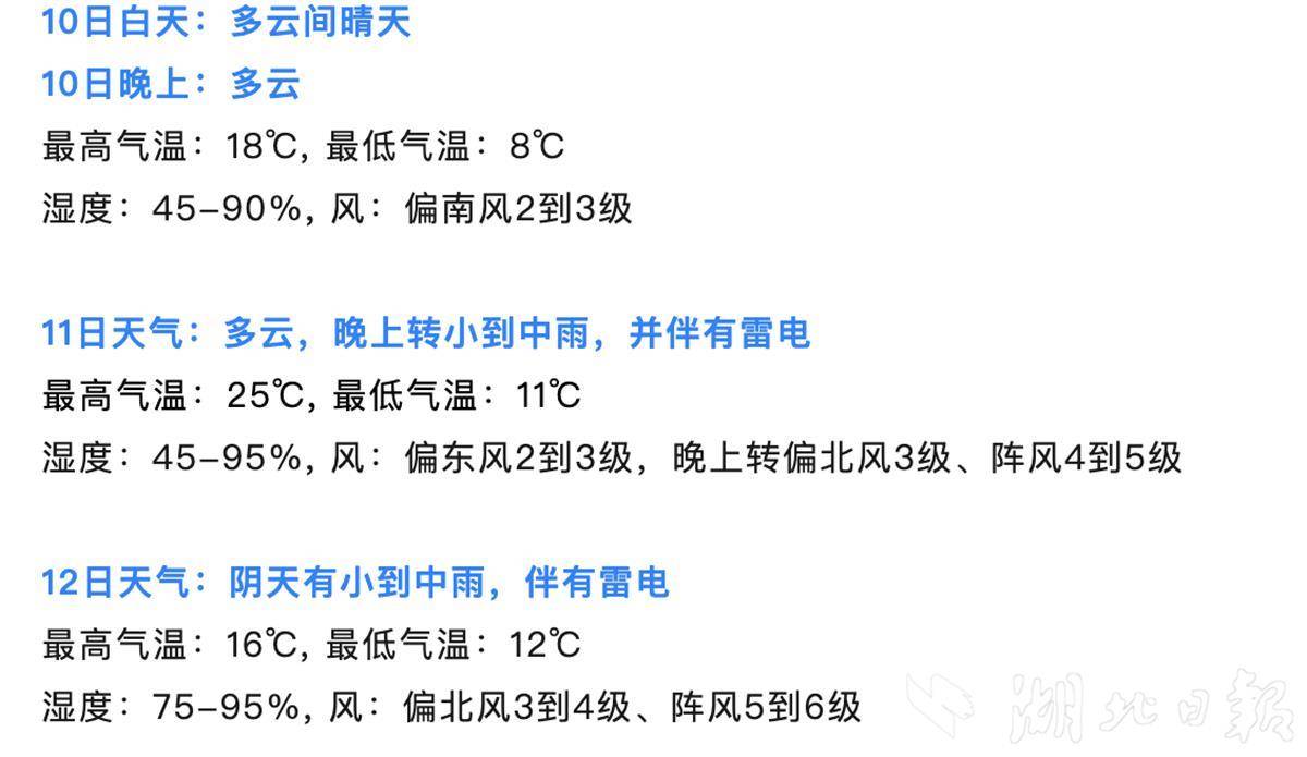 湖北日报讯(记者汤炜玮、通讯员陈声超)3月10日从武汉市气象局获悉,今明两日晴暖限时放送,明日午后最高气温直冲25℃,届时最低气温也突破将10℃;但需要注意的是,明晚起冷空气发威,雨水雷电大风齐上阵,气温将有所下降。