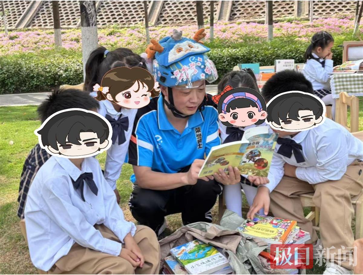 4月23日世界读书日,武汉市江汉区汉兴街道玉兰里社区上演温馨一幕:头戴樱花头盔的外卖骑手张宝剑化身“特殊导读员”,与数名萌娃在红旗渠路游园共度书香时光。这位曾多次见义勇为救助伤者的“急救侠”,此次以全新身份参与到“童书童梦 社园联盟”读书分享活动中。