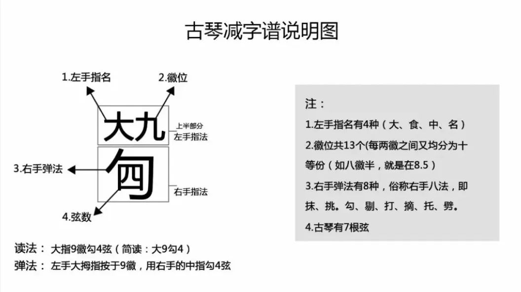 “到了唐代,琴家曹柔在文字谱的基础上加以革新发明了减字谱,用一个字代替一句话。”丁承运举例,减字谱的单个字不能直接读,比如左边一个“大”字,右边一个“九”字,下面一个勾,里面一个“勾”的外框,再加一个“七”,就读作“大九勾七”。“大九勾七”的意思是,左手大指按于第九徽位,右手中指勾弹第七弦。这就是古琴减字谱表达的含义。