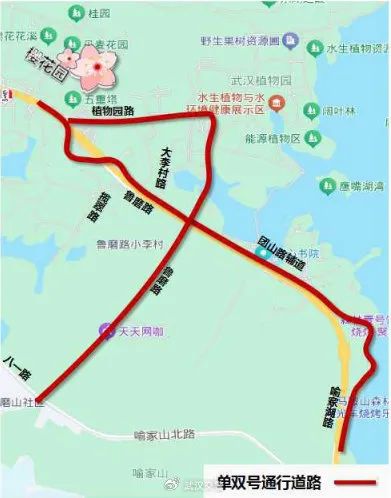 鲁磨路(八一路至樱花园大门)、团山路辅道(喻家湖路 至团山路)、植物园路(鲁磨路至团山路)、东湖南路(洪山路至卓 刀泉北路)、卓刀泉北路(东湖南路)
