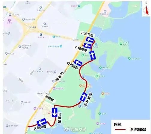 1、黄鹂路(省博路至沿湖大道)只允许机动车由西向东(省博路往沿湖大道方向,公交车除外)、沿湖大道(黄鹂路至广场北路)只允许机动车由南向北(黄鹂路往广场北路方向)、牡丹园路(沿湖大道至东湖路)只允许机动车由东向西(沿湖大道往东湖路方向)(沿线小区及单位车辆除外)。