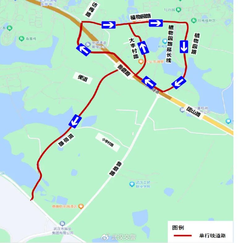 临时开辟武汉城市学院内部道路,引导车辆由雁中路→ 城市学院停车场入口→城市学院南门出口→落雁路→雁中路,形成微循环。