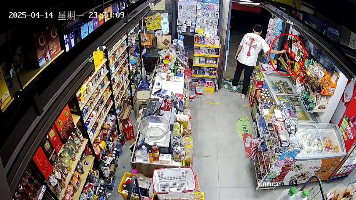 “白T恤”从店门边的货架上抓起两只食品袋快步离开