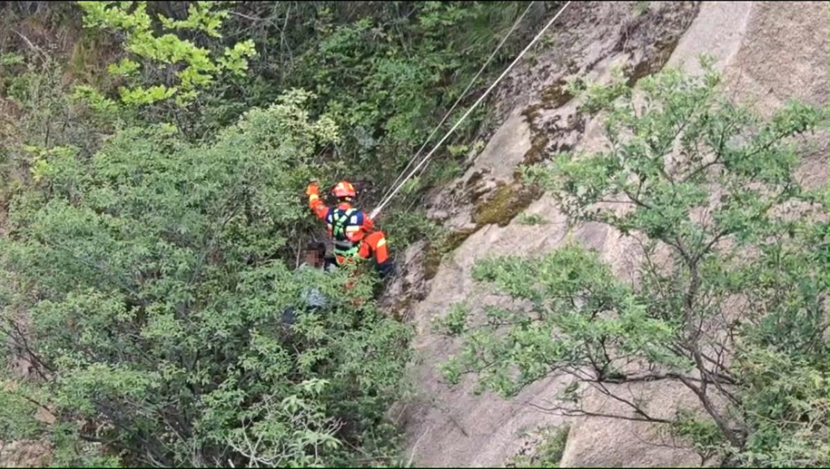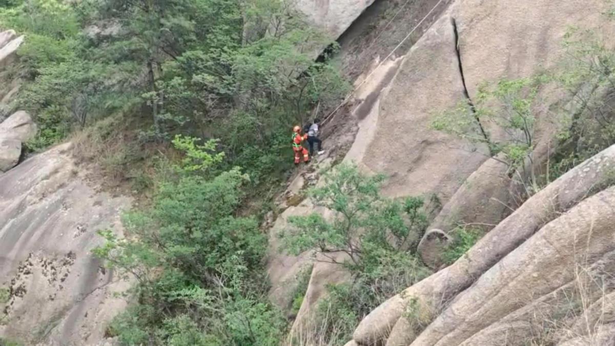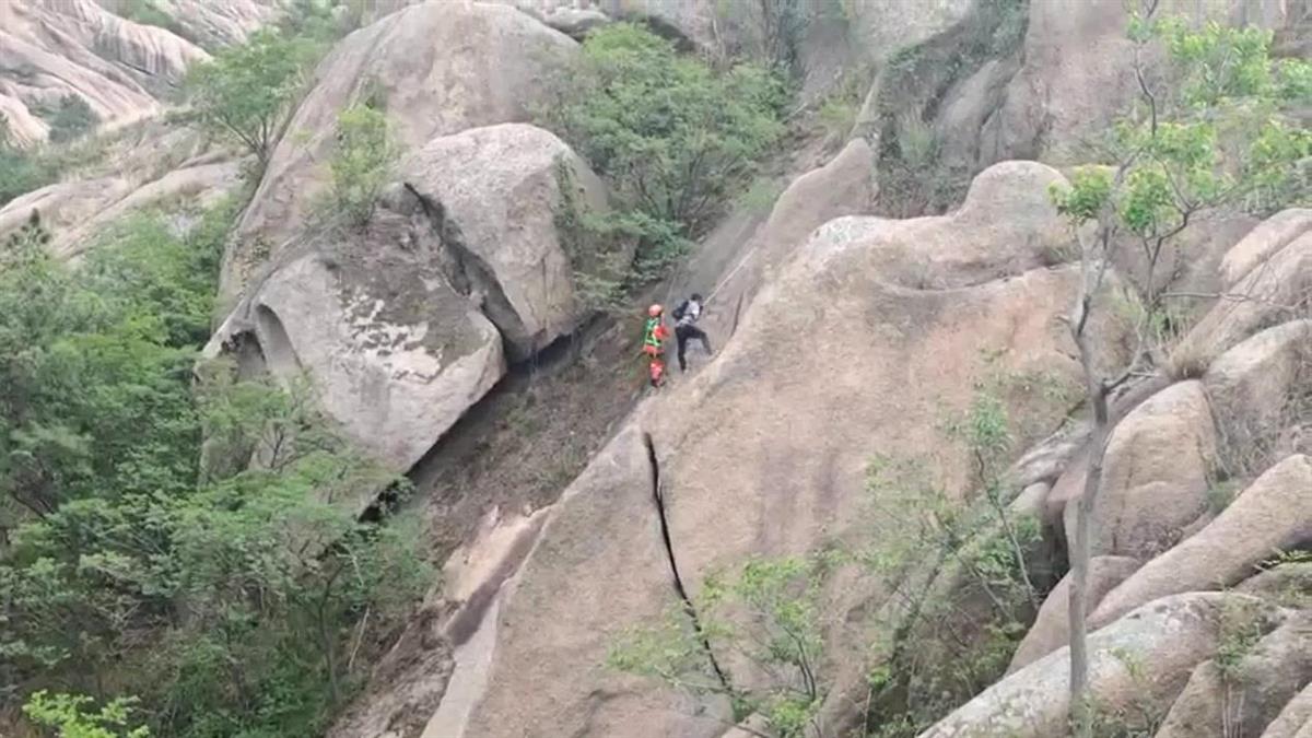 消防员在到达山脚下后,与赶来的民警一同徒步进山搜寻。由于山内通讯信号较弱,搜救人员一时无法准确判断出被困者具体位置,后经被困男子通过手机向现场民警发送出的被困位置照片,搜救人员在判断出被困者方位后,便迅速赶到事发地,并在一处崖壁上发现被困男子。