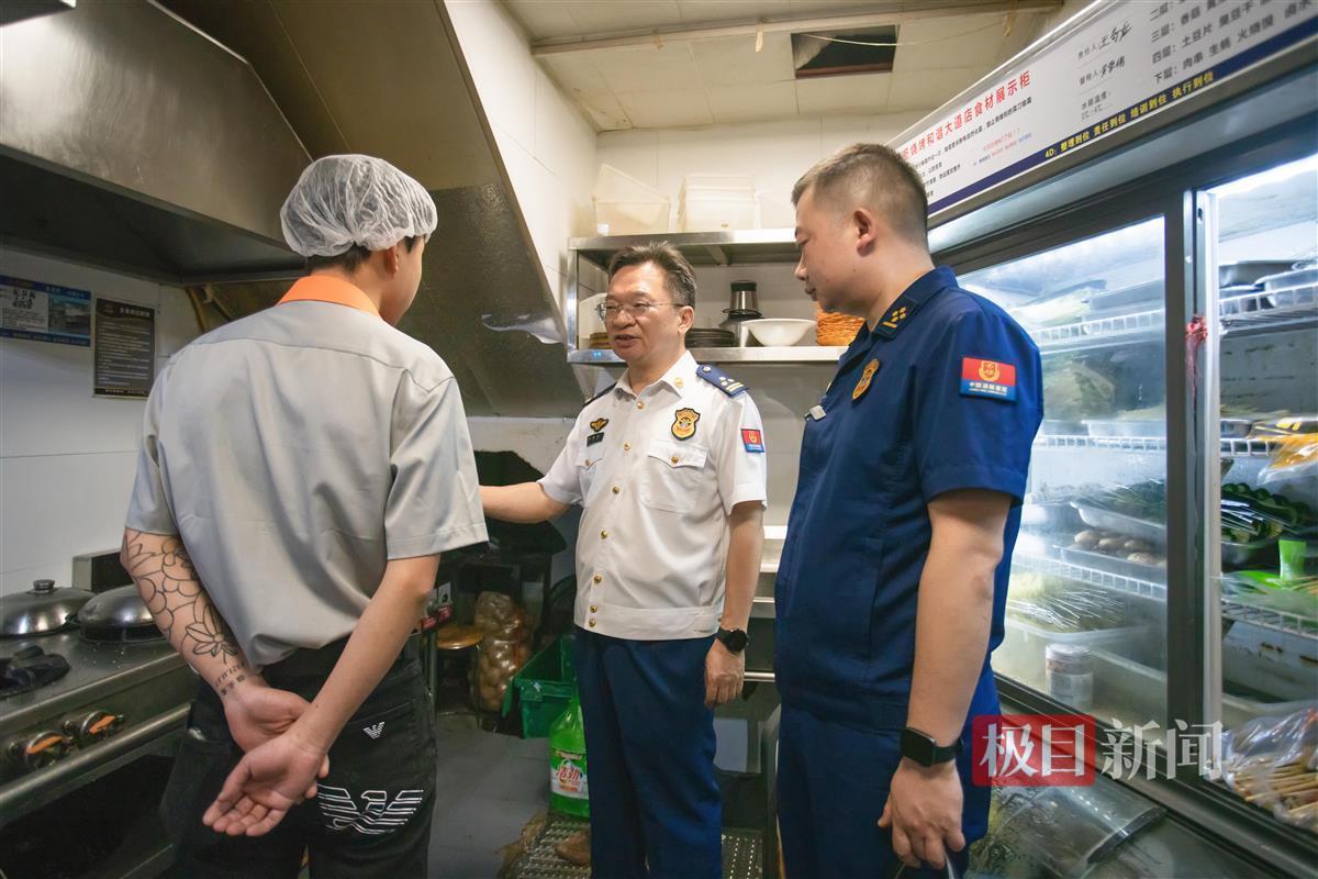 当晚,武汉市消防救援支队支队长胡庚松带队走进江岸区和谐大道蔡明纬、大圣烧烤、柴火鸡甲鱼馆、金海楼等沿街商铺、餐饮场所,督导消防安全夜巡工作,现场详细了解了各场所消防安全责任制落实情况,重点察看了各餐饮场所用火、用电、用气是否遵守安全规章制度,消防设施器材配置是否齐全和完好,电气线路、燃气设备管路设置是否合理等情况。针对检查中发现的隐患问题,要求商户立即整改,并结合近期全国重大火灾案例叮嘱各商户要高度重视消防安全工作,提高消防安全意识,定期进行自查自改,严防火灾事故发生。