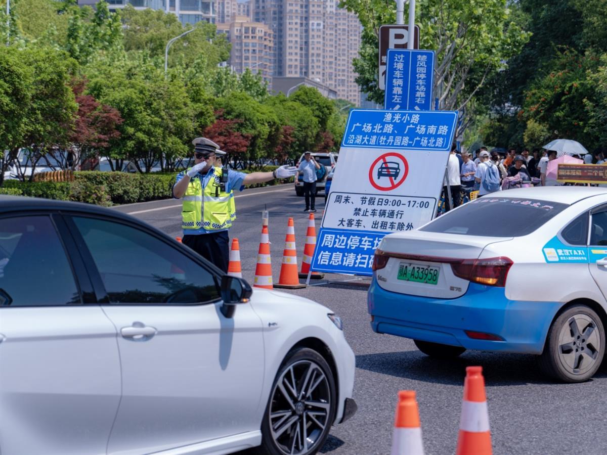 当日,东湖风景区也迎来如织的游客。为确保景区道路交通顺畅,东湖交通大队对部分道路实施临时交通管制。在梨园广场、东湖隧道鲁磨路出口等重点路段,交警提前放置交通管制标识,设置流动执勤岗,往返巡逻疏导交通。同时,梨园广场斑马线旁的“伸缩移动护栏”、楚风园停车场入口处的“智慧喇叭”等一批新装备“上线”,助力交通引导。