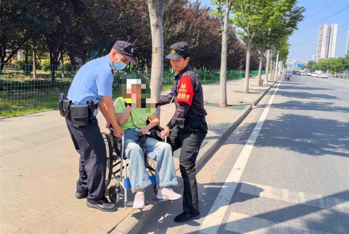 李继安推着轮椅步行前往医院。此时,正值正午,地铁站外阳光直射,晒得人睁不开眼。李继安和宋玮顶着烈日,一路小跑沿着站外的马路步行。地铁站距离医院急诊约1000米,途中遇到道路不平或有台阶的地方,他便和护卫抬着轮椅向前走。18分钟后,两人推着冯女士终于抵达了医院。李继安的警服也被汗水打湿。