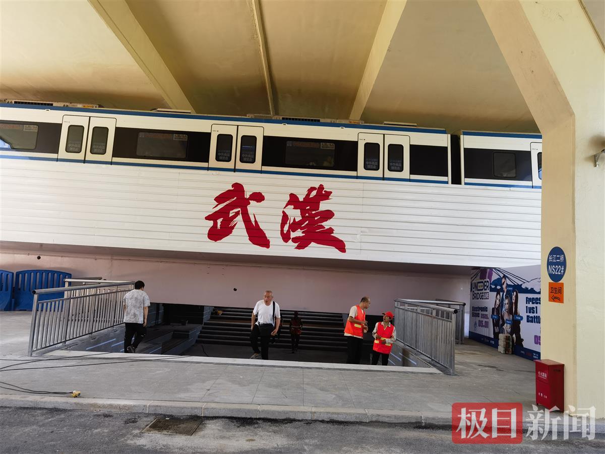 顺着地面的涂鸦指引走向轻轨打卡区,下穿通道的灯光恰好浮出地面,红色的“武汉”地标仿佛指引人们穿越进时光的隧道,轻轨列车恰时从头顶呼啸而过,引得大家纷纷在此打卡。