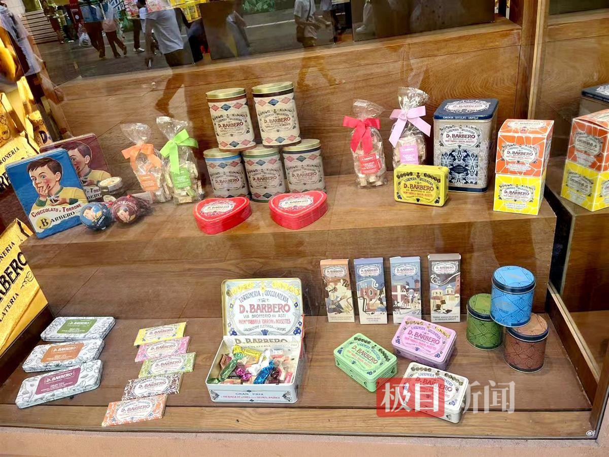 店铺货架上摆满了各种精致的意式甜品,既有手作牛轧糖、巧克力等经典意式甜品,也有莫斯卡托、布拉凯多等多款意大利精品起泡酒等产品。不少市民和外地游客正在挑选着各类美食,收银台前也排起了长队。部分顾客则坐在一旁,品尝着试吃的巧克力和起泡酒,脸上洋溢着满足的笑容。