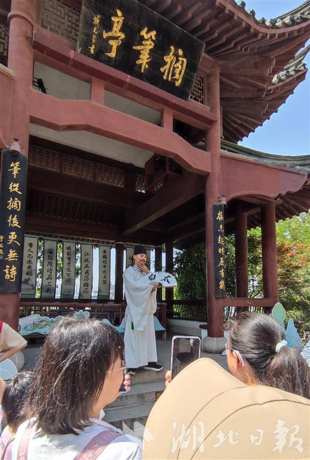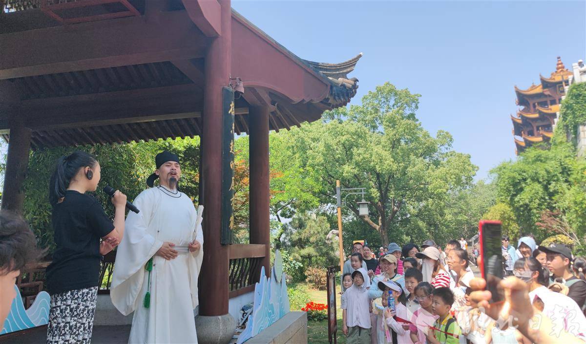 “鄙人就是来自唐朝的李太白是也。今日黄鹤楼上令人心旷神怡呀,不如就让我们来一起对一下诗,如何?答对有奖哦……”5月1日上午,人潮熙攘的武汉黄鹤楼公园内,一袭古装的“李太白”出现在搁笔亭中,迅速引来游客们的围观和热烈互动。