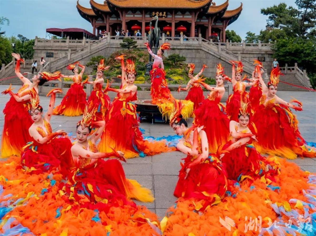 上午10时30分,黄鹤楼西区广场人潮涌动。15位身披金红羽衣的舞者翩然登场,挥动长袖,以刚柔并济的舞姿再现凤凰浴火重生的壮美。这是蛇年央视春晚惊艳全国的同款舞蹈《凤舞九天》。演员中,有14位参与过蛇年春晚演出,分别来自武汉音乐学院和武汉工商学院。演出中,领舞“凤头”的男演员腾跃而起,14名舞者随之盘旋聚散,时而如云间漫步,时而似烈焰翻涌,衣袖翻飞间与黄鹤楼的飞檐翘角交相辉映。“太美了,每一个动作都很有感染力。”广东来的游客刘先生点赞。