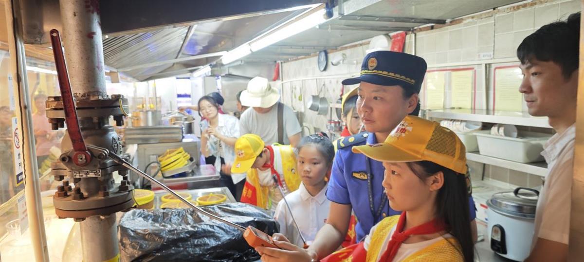 活动前,城管队员演示燃气检测仪使用,市场监管人员讲解食材存储规范,15名“户部小侍郎”认真学习,迅速掌握隐患排查要点。