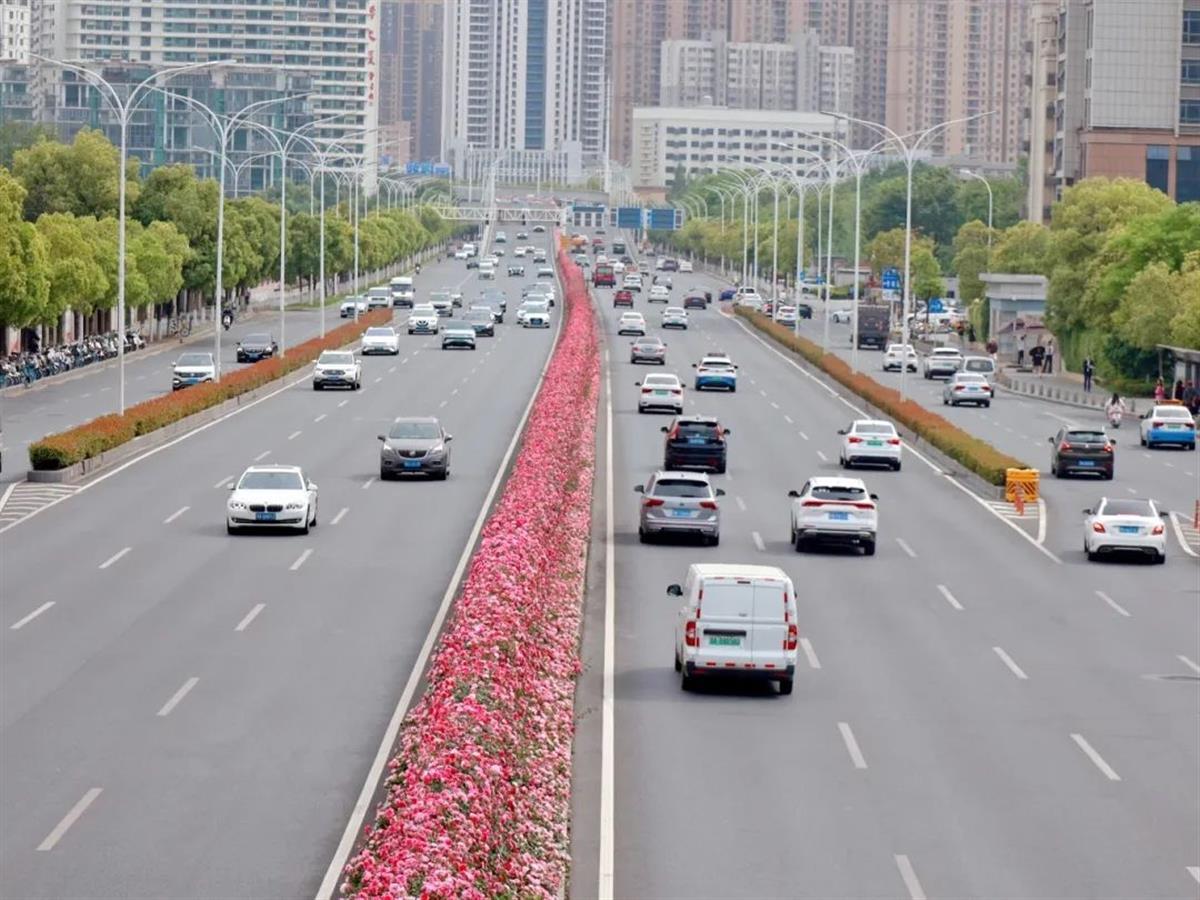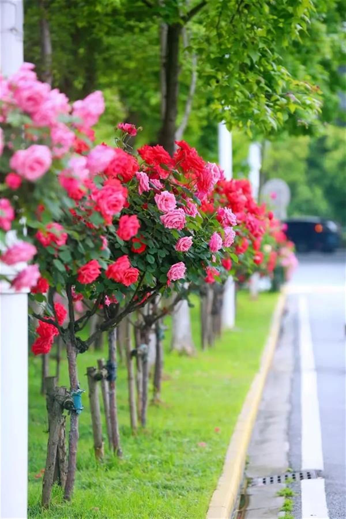 武汉首条“全月季”景观大道,5.5公里红粉花带绵延如画,莫海姆、黄从容、红从容、仙境、大游行等争奇斗艳。放缓车速,摇下车窗,感受一路生花的浪漫。
