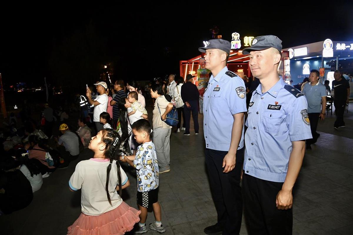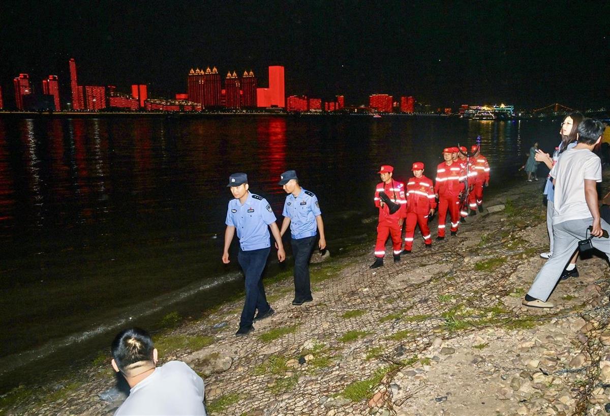 随着夜幕降临,灯光秀按时精彩上演,分局启动大客流单向循环措施,引导游客有序进出江滩,并调派长江义警带齐救援救生装备,开展步巡和救生艇巡控,缓解水岸线压力,防止游客夜间亲水戏水发生意外;在长江水面上,2艘水警快艇在核心水域来回游弋,动态处警,随时准备出警救援。
