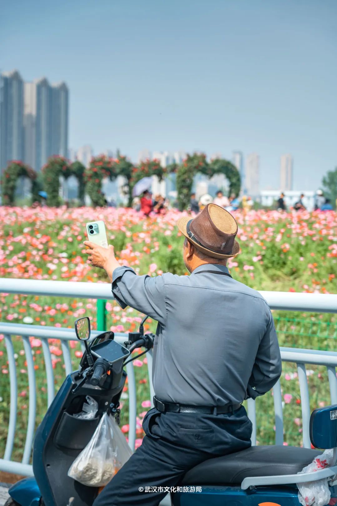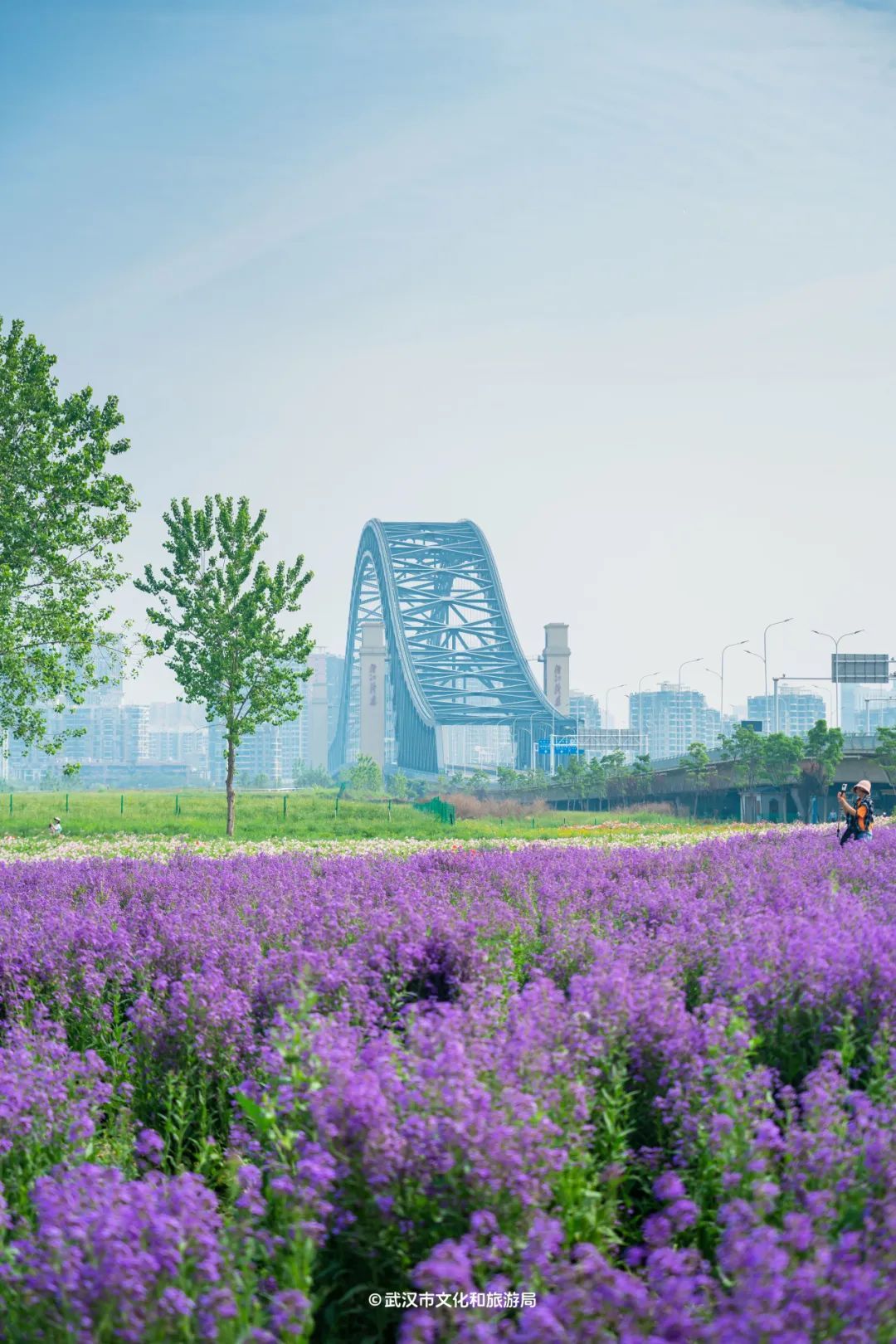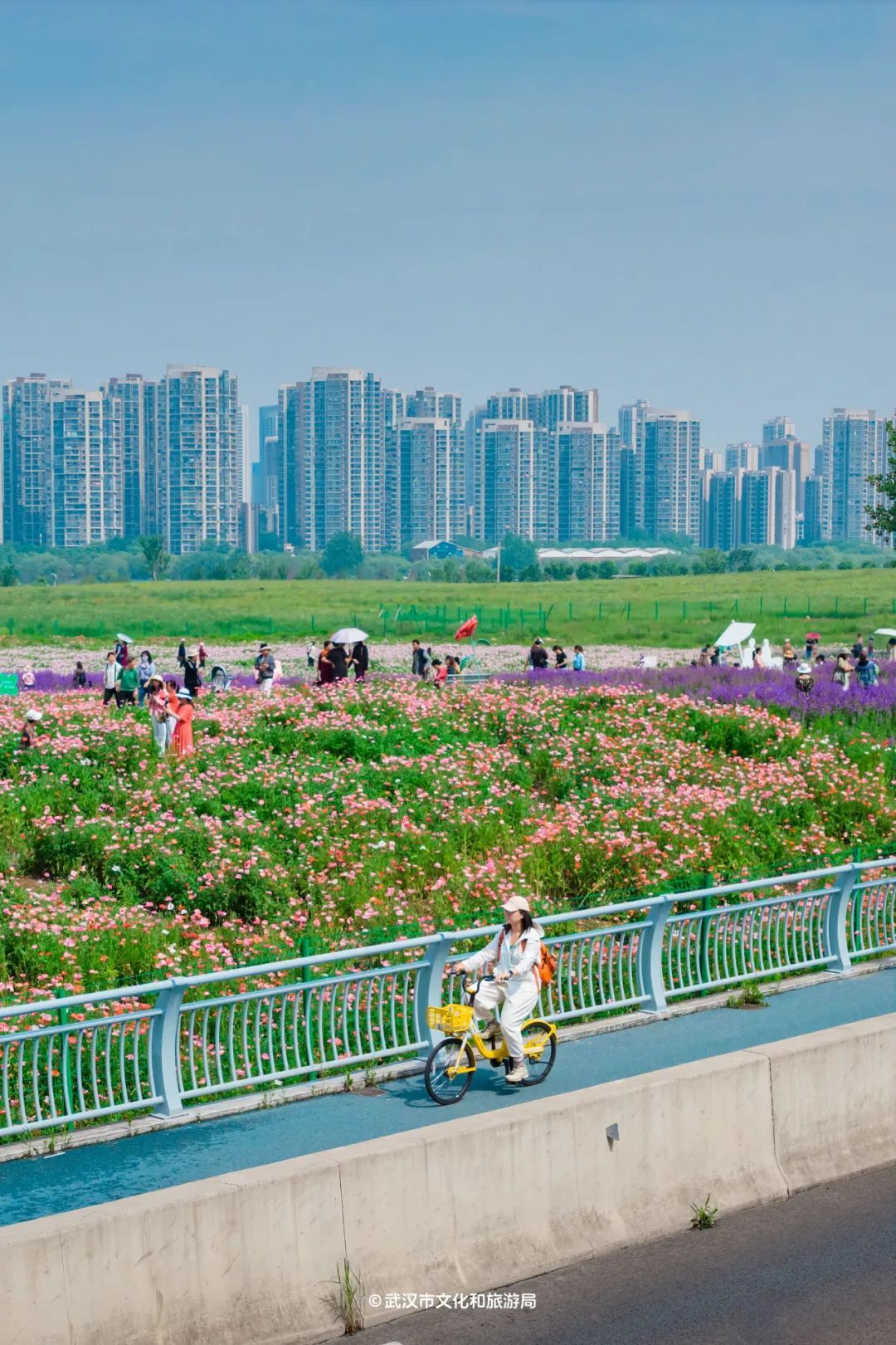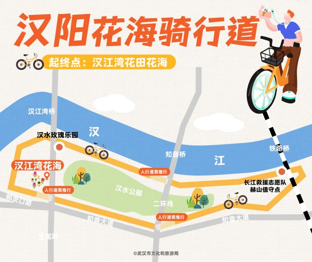 定位汉阳区「汉江湾花田」,30000㎡的花海免费看。小众的是,花海沿途有条8km的骑行环线。