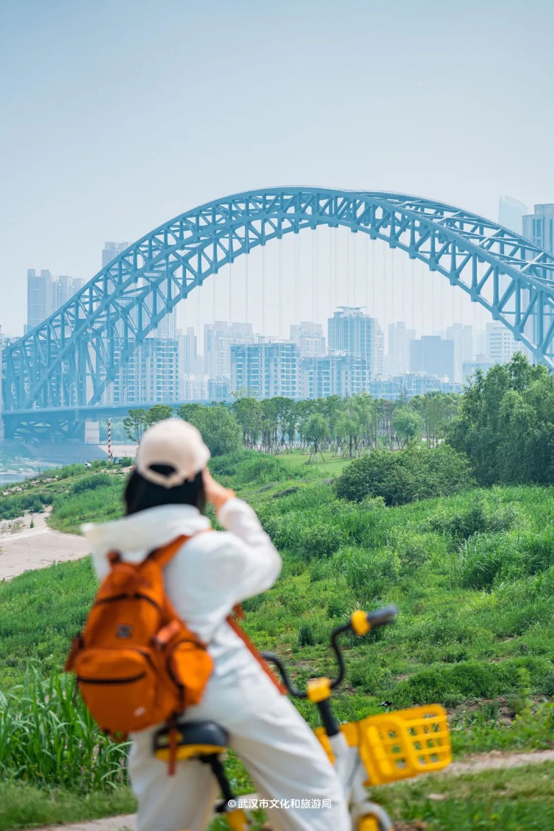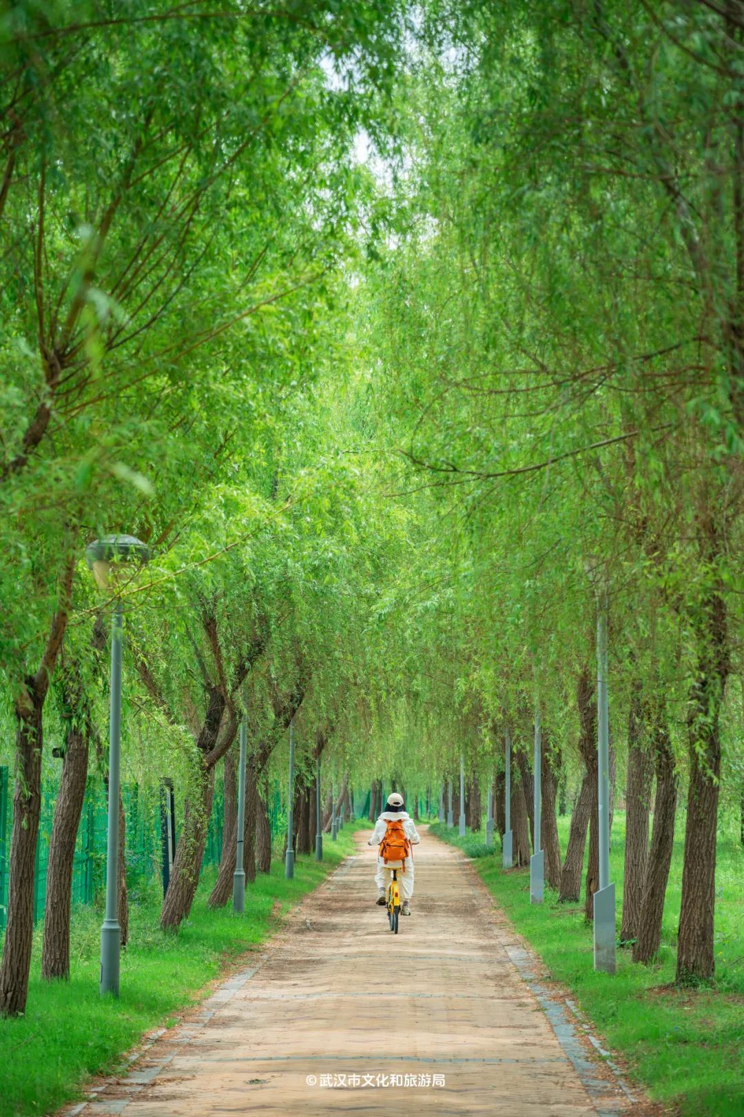 顺着公园石桥边的绿色步道继续骑行
