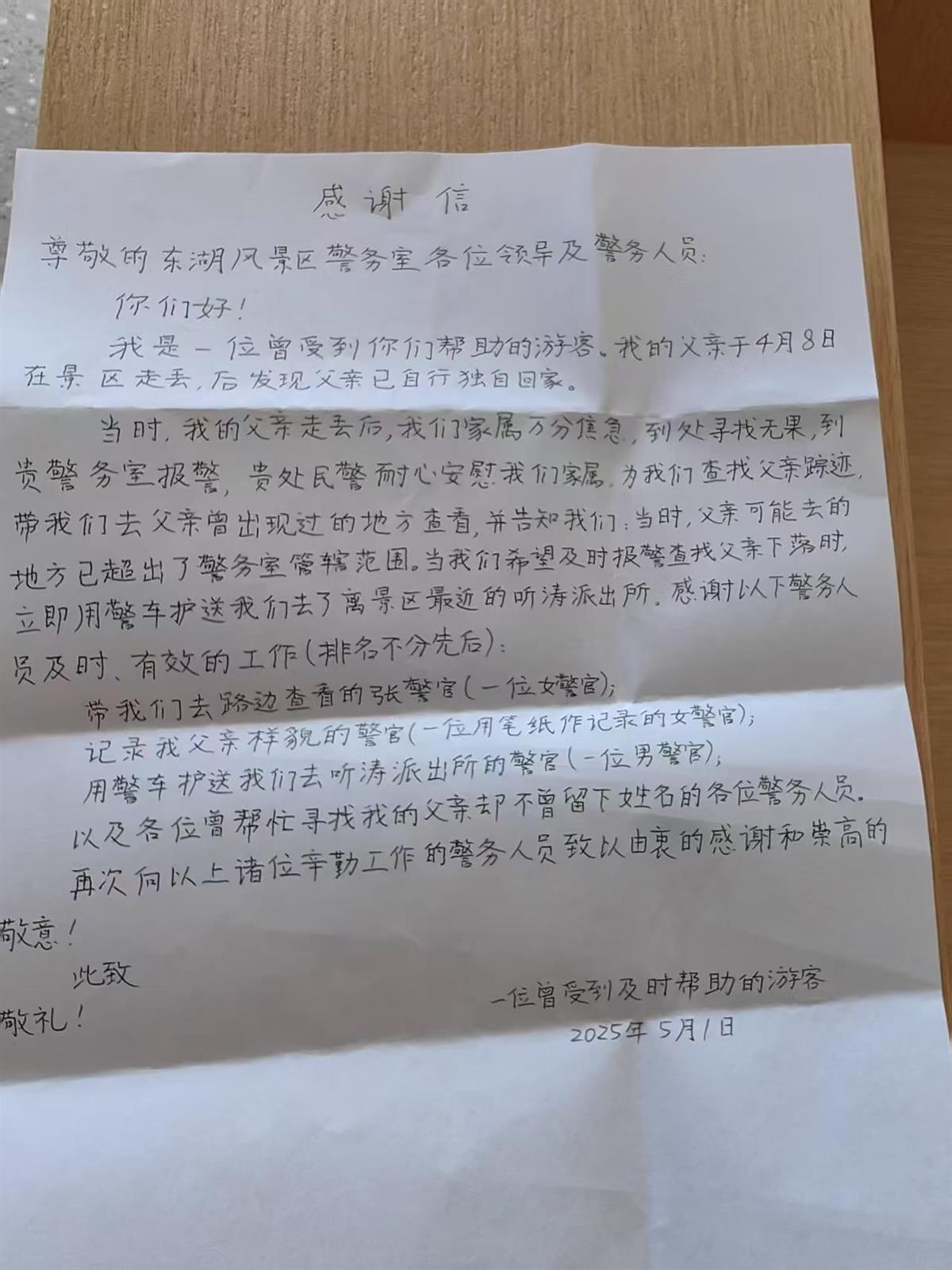 “这都是我们应该做的,你们来这里游玩就是对我们的信任。”5月2日上午8时,梨园文旅联勤服务站的民警接过游客王女士(化名)手写的感谢信时如是说。这封感谢信源于4月8日的一起走失警情——王女士父亲在东湖绿道散步时迷失方向,梨园文旅联勤服务站民警张蕊热情接待了她并和东湖分局听涛派出所的多名警力接力找到了老人。王女士在五一假期特意安排了再次来东湖游玩,并手写了这封感谢信。“去路边查看的张警官”“记录我父亲样貌的警官”“用警车护送我们去听涛派出所的警官”,细心的她在信中一一注明,只为感谢每一位帮助过她的警察。