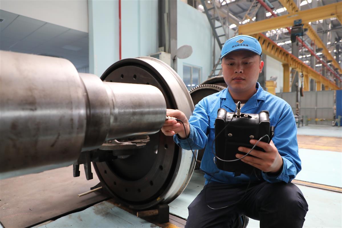 5月1日,在中国铁路武汉局集团公司武汉大功率机车检修段C4库里,探伤工邓凡半蹲在机车旁,左手熟练地操控着探头,在关键部件上反复移动,右手随时准备调节探伤仪的灵敏度,他的双眼紧紧盯着屏幕上的波形,不放过任何一条可疑的裂纹。