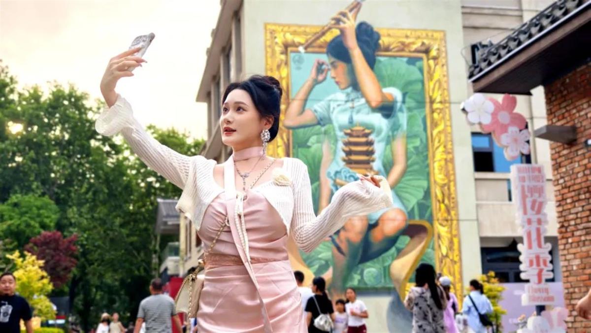 5月3日,武昌斗级营街区的一幢建筑外墙上,高达12米、宽7米的巨幅壁画《玉笛黄鹤》引来众多游客拍照,成为武汉文旅市场又一亮眼的文化地标。