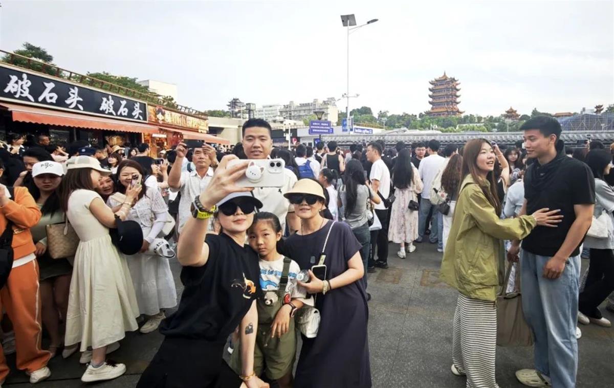 节日期间,司门口黄鹤楼地铁站旁的红墙人气爆棚,众多游客以红墙为背景拍摄远处的黄鹤楼。来自长沙的游客李女士和家人特意来打卡。她说:“这里真的很出片,感觉每一张都能当壁纸。”