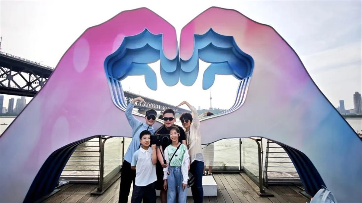 沿着斗级营一路走到武昌中华路城市阳台,一面手比爱心的打卡墙临江而立,透过“爱心”可以看见广阔的江面、巍峨的武汉长江大桥,远处的龟山电视塔映入眼帘。不少游客纷纷以“爱心”墙为背景,“比心”拍照。
